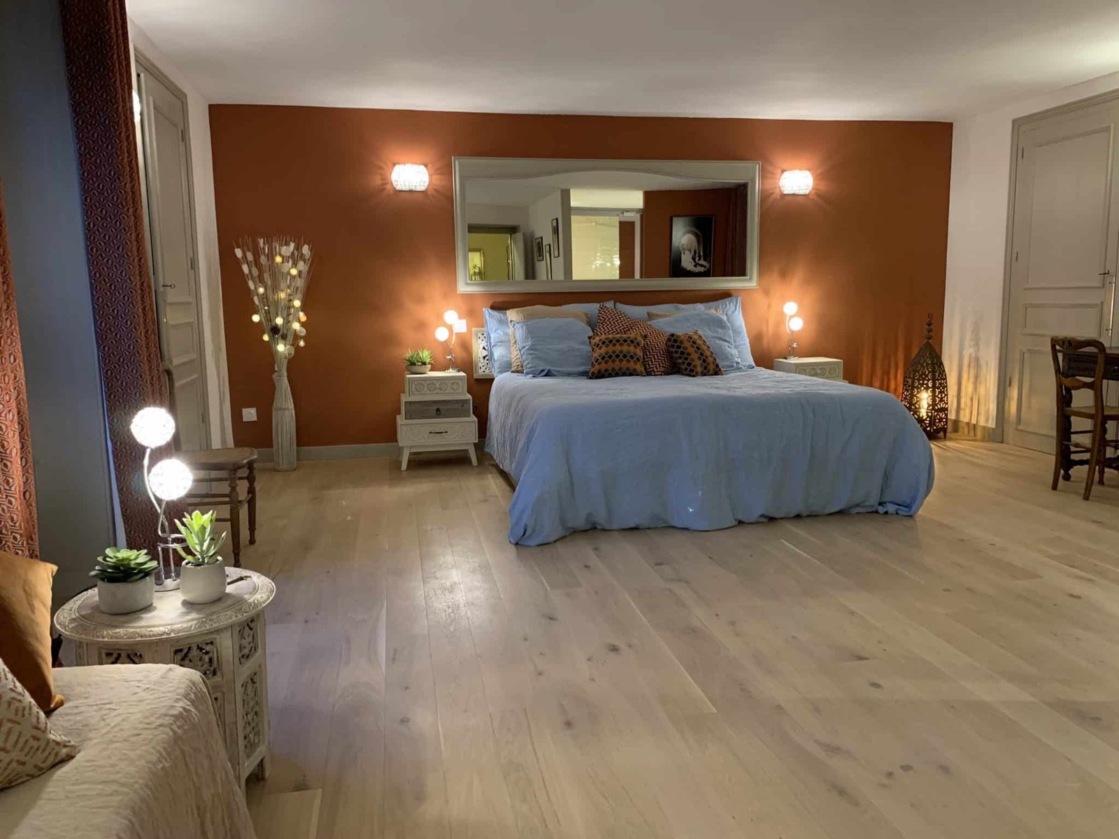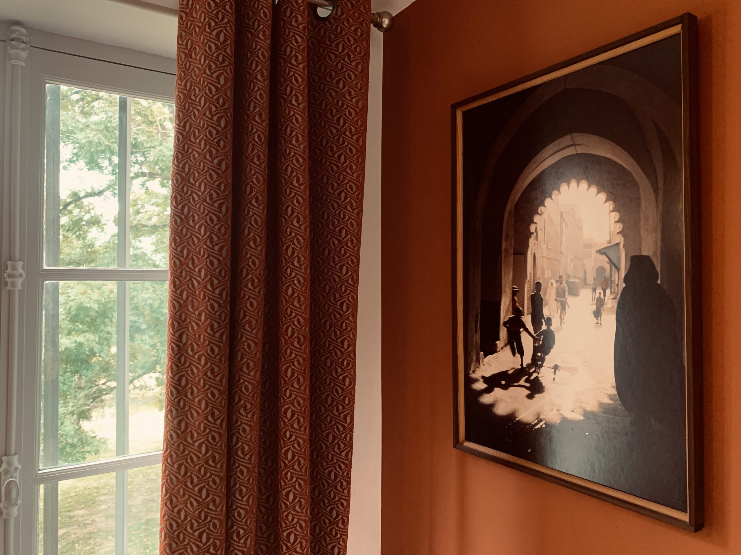 Située dans l’aile nord du château, cette chambre ne présente pas d’éléments architecturaux remarquables, mais nous lui avons insufflé une âme unique, inspirée de l’histoire familiale. Mon grand-père, directeur de la régie des tabacs à Casablanca dans les années 40-50 et photographe amateur passionné, a immortalisé la beauté des souk de Marrakech, du sud du Maroc et des pêcheurs andalous. Mon père, né à Casablanca et foreur d’eau dans les années 70, a sillonné l’Afrique et la péninsule Arabique, ramenant des bijoux, flacons d’encens, armes traditionnelles et autres trésors du Maroc, du Nigeria, d’Arabie Saoudite et de Syrie.